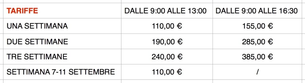 Orario: dalle 9:00 alle 16:30. Possibilità di uscita alle ore 13:00 – PRANZO AL SACCO