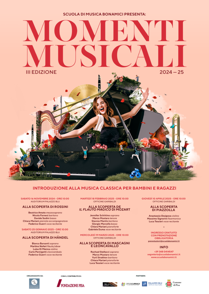 La Scuola di Musica Bonamici è lieta di presentare la terza edizione del ciclo di concerti “Momenti Musicali. Introduzione alla musica classica per bambini e ragazzi”.
