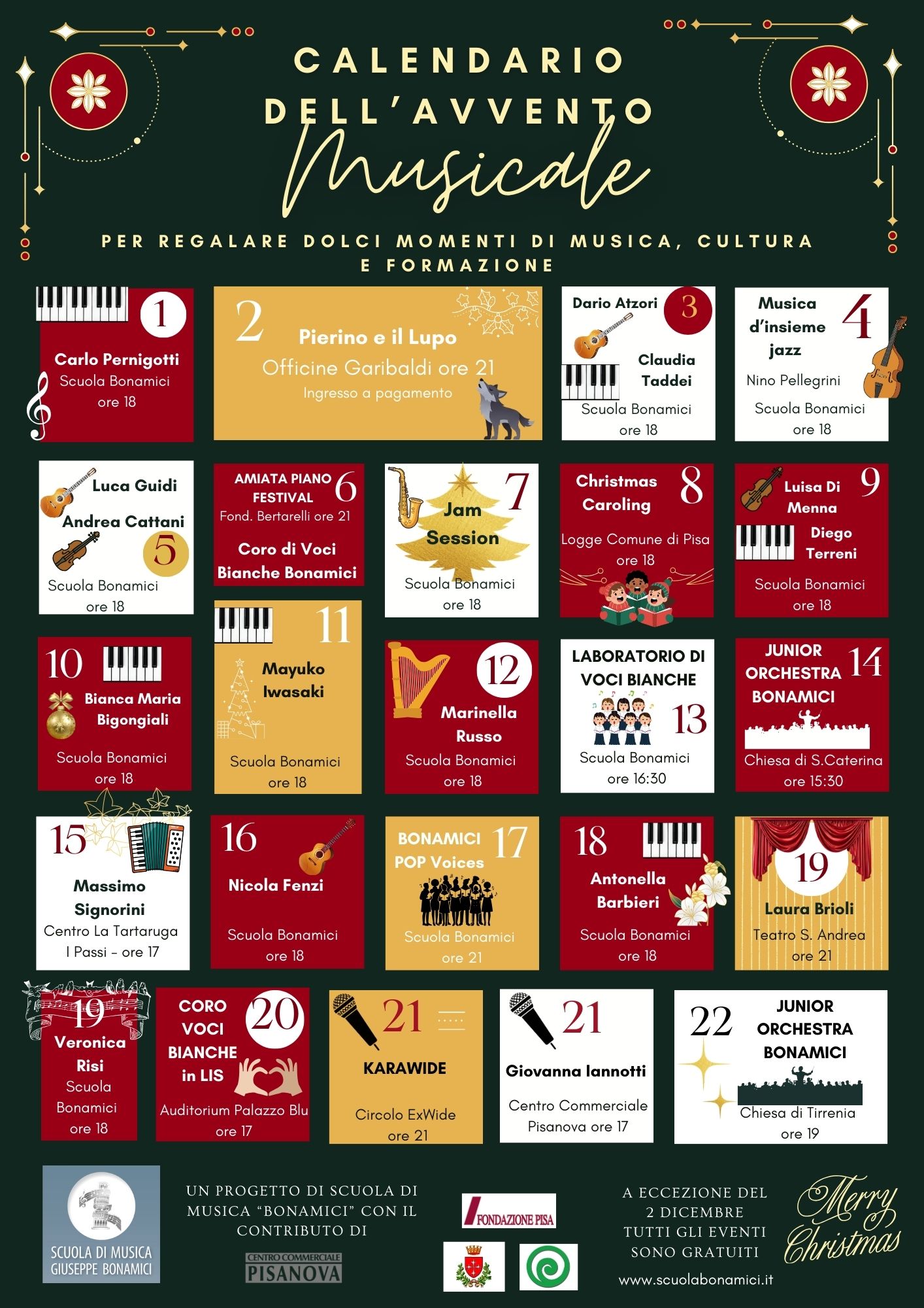 La Scuola di Musica “Giuseppe Bonamici” di Pisa annuncia con entusiasmo un’iniziativa unica nel suo genere in occasione delle festività: il Calendario dell’Avvento Musicale. Non cioccolatini, ma dolci momenti di musica, cultura e formazione, con un concerto gratuito al giorno che vedrà esibirsi allievi, insegnanti, musicisti professionisti, cori e orchestra in un ricco programma che abbraccia tutti i generi musicali.