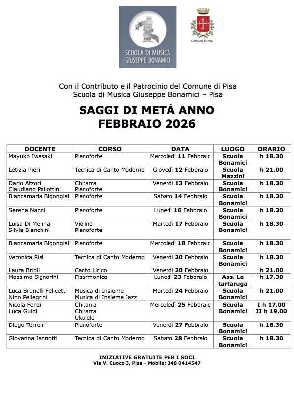 Saggi di metà anno 2025-26 Arianna RomagnoliPosted on 31 Gennaio 2026 Pubblicato in Eventi, Notizie . Si svolgeranno dall’11 al 28 febbraio i Saggi di metà anno 2025-26 della Scuola di musica Bonamici, con il contributo e il patrocinio del Comune di Pisa. Di seguito il programma completo. Buon divertimento e buon ascolto a tutti! ‹ Tutti al piano, corso di formazione con Alessandra Manti Taggato con: Saggi